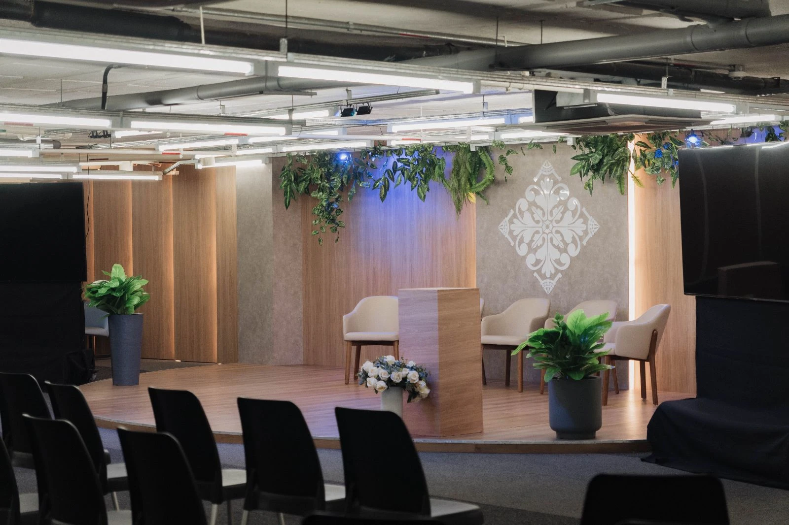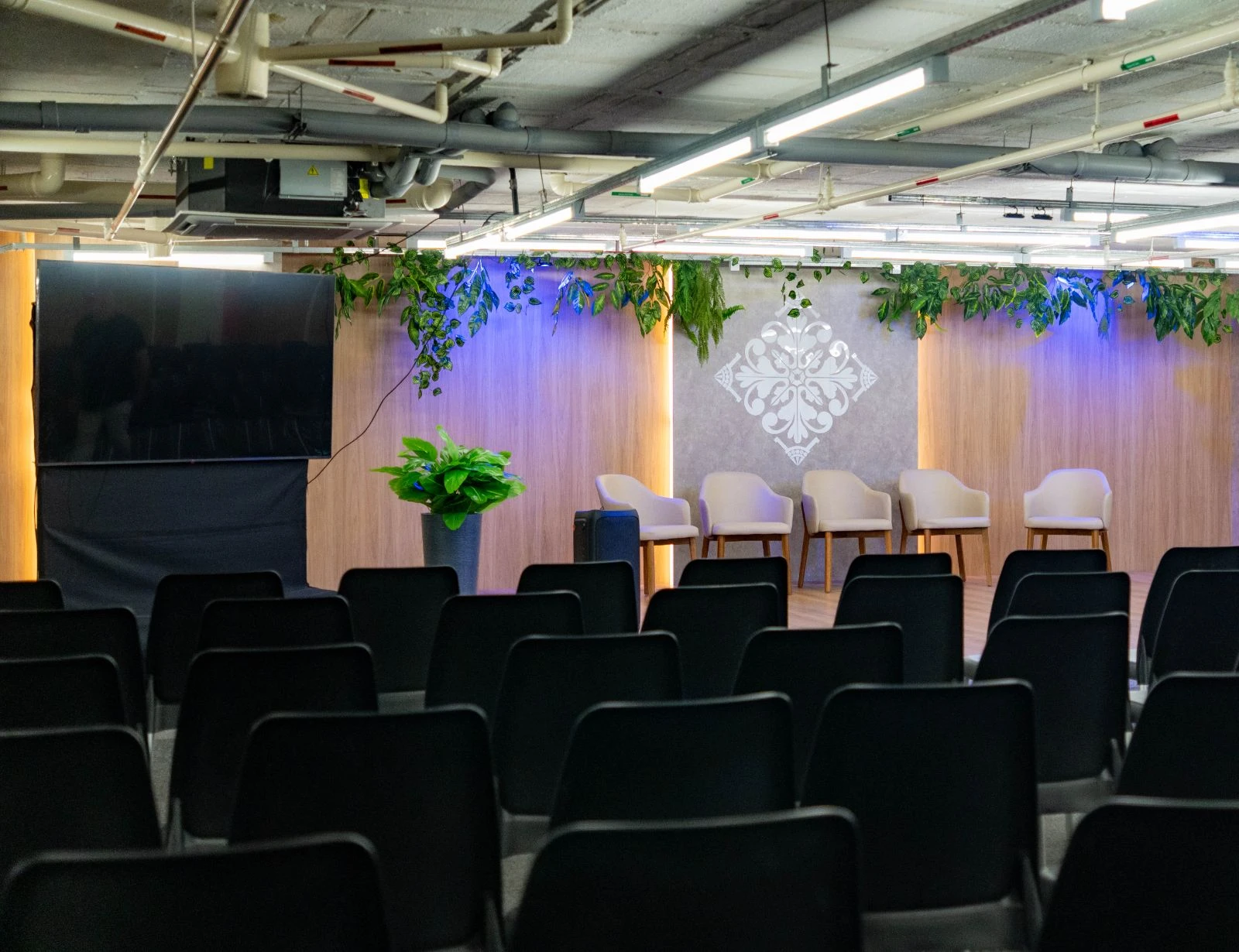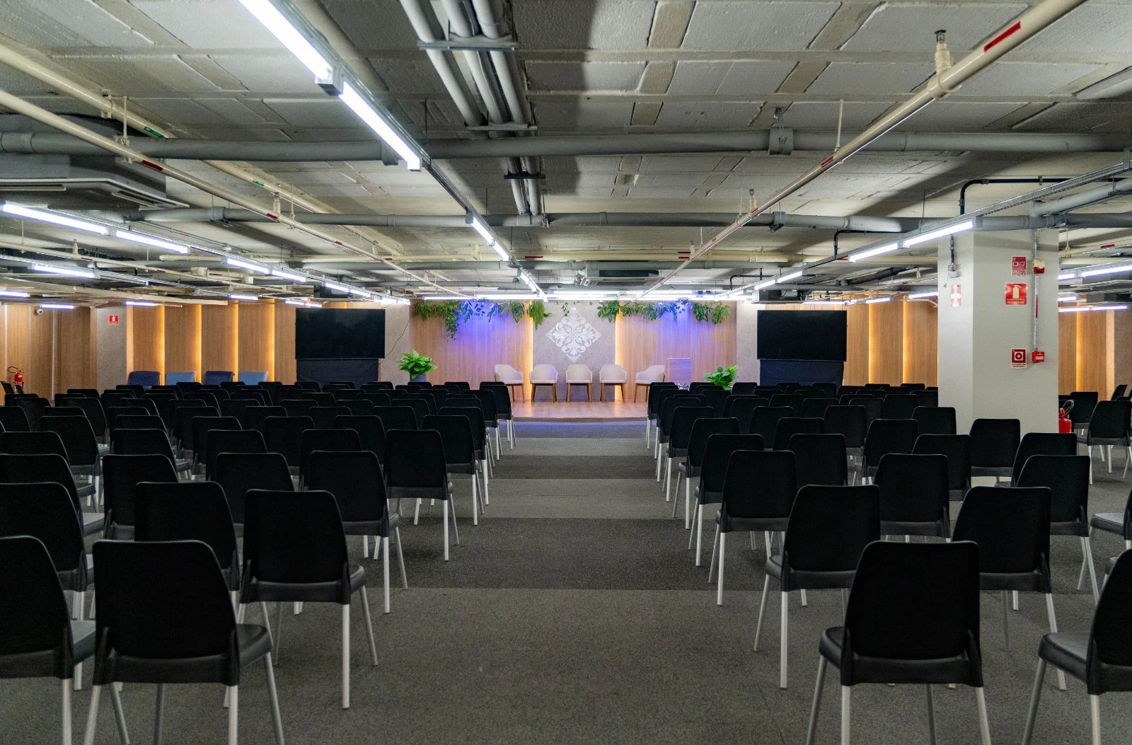 Para a realização de palestras e encontros, o espaço oferece 300 cadeiras, sistema de som, além de duas telas de 75 polegadas para projeção. Há também 5 poltronas que proporcionam ainda mais conforto em ocasiões especiais.